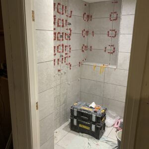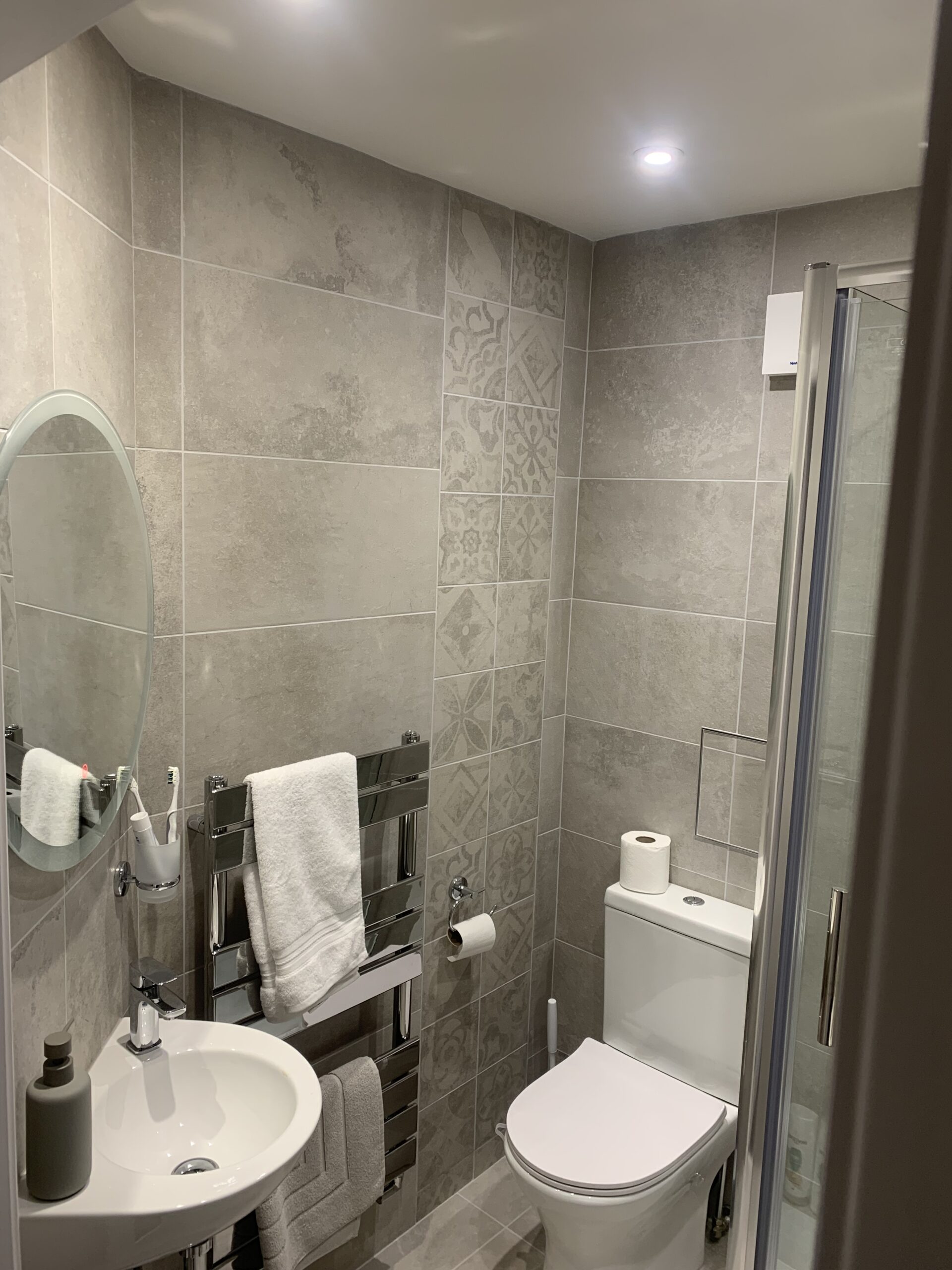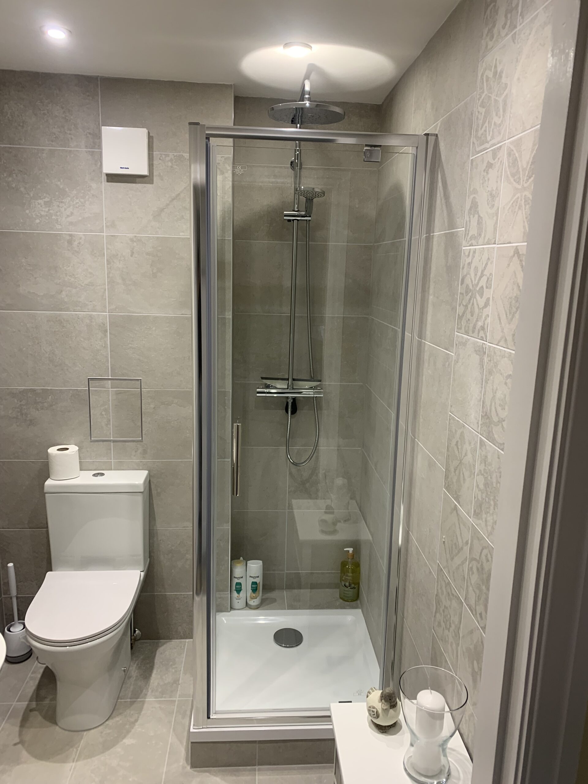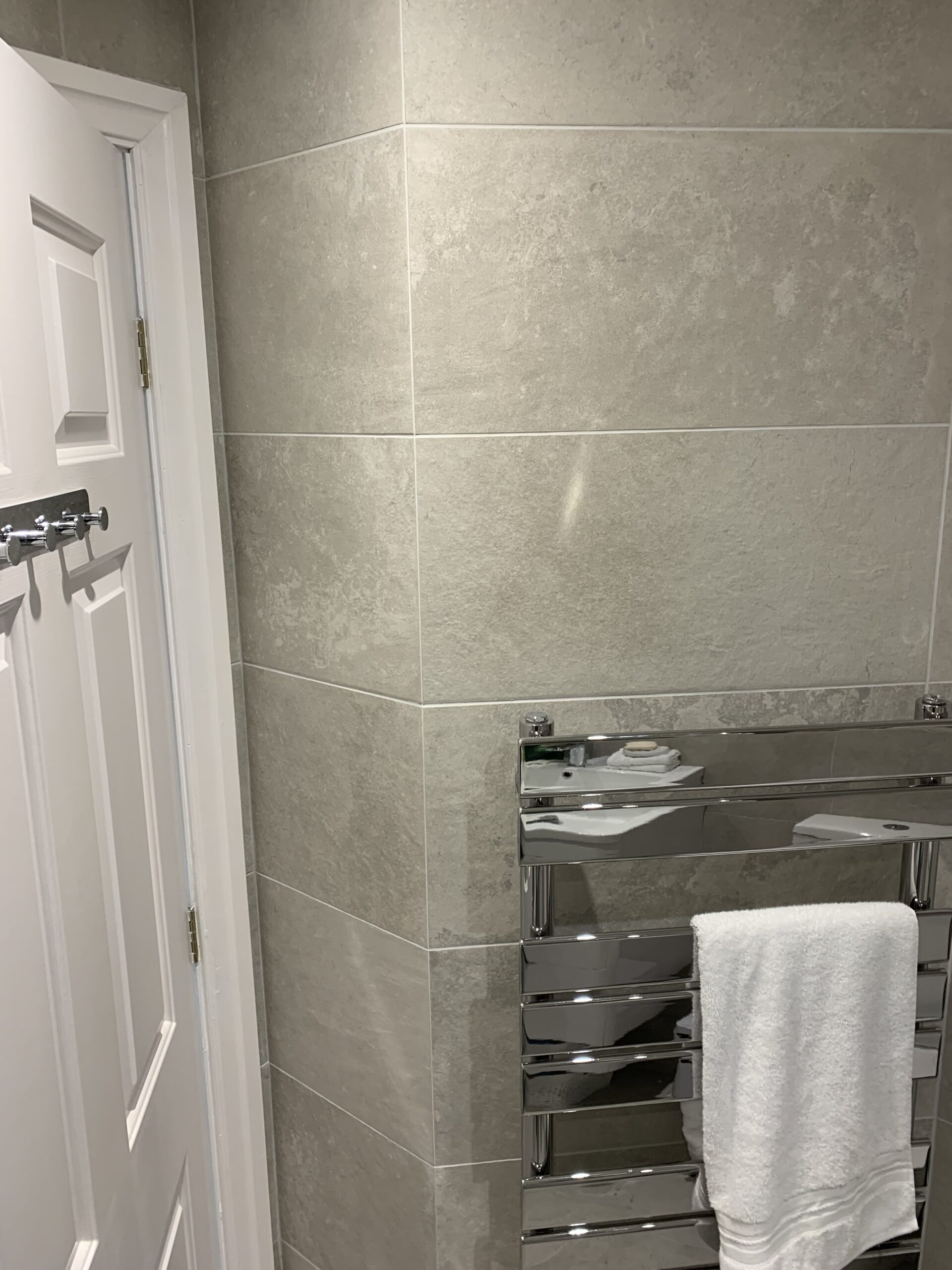 Full floor to ceiling tiles installed with integrated tiled hatch for access to mains water supply.