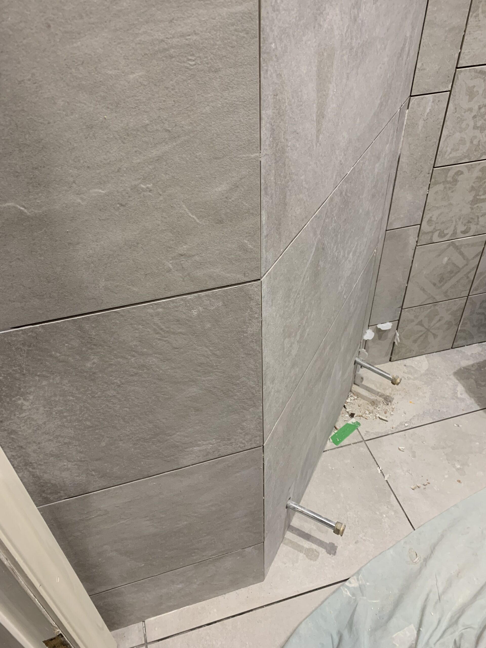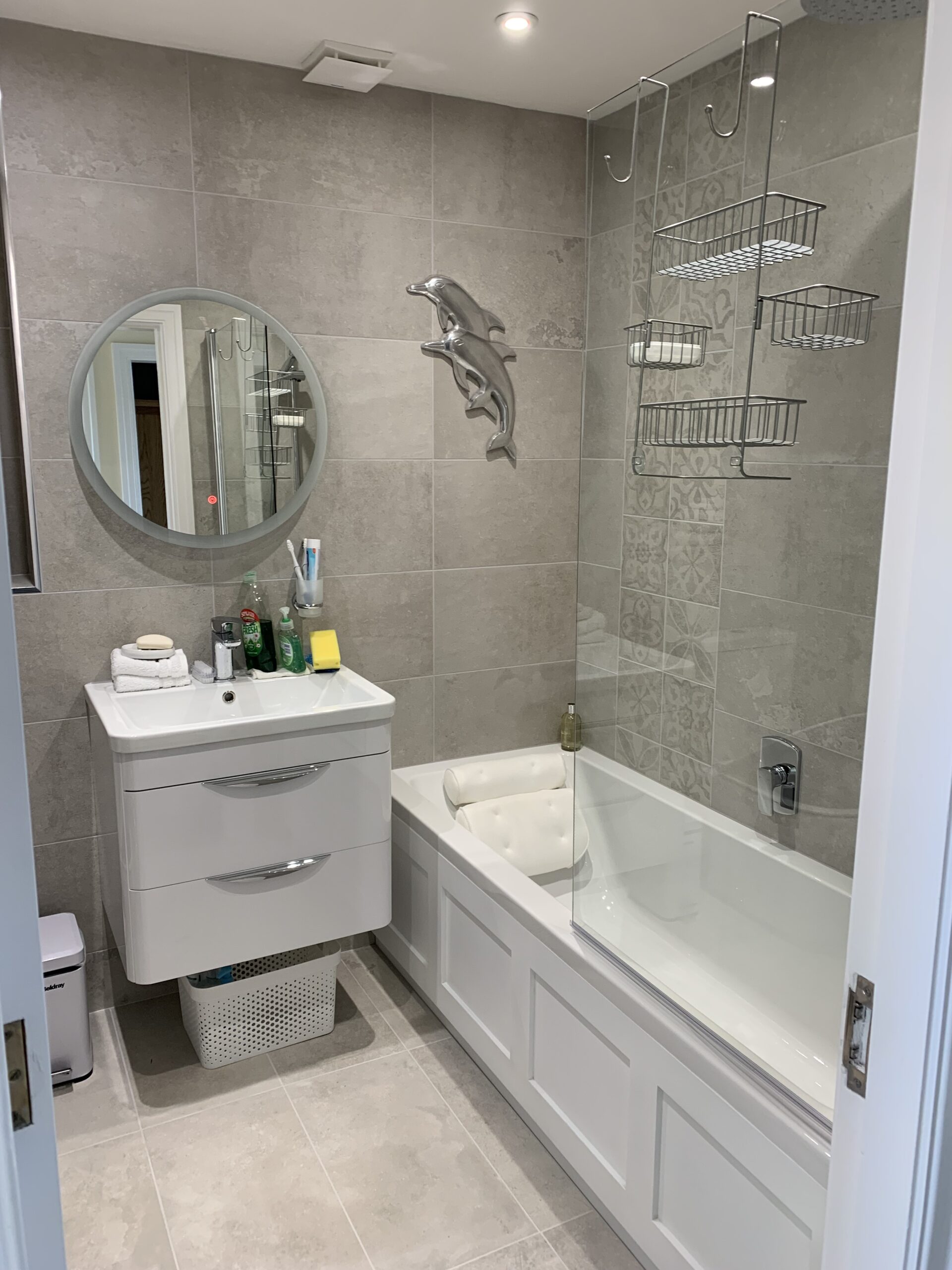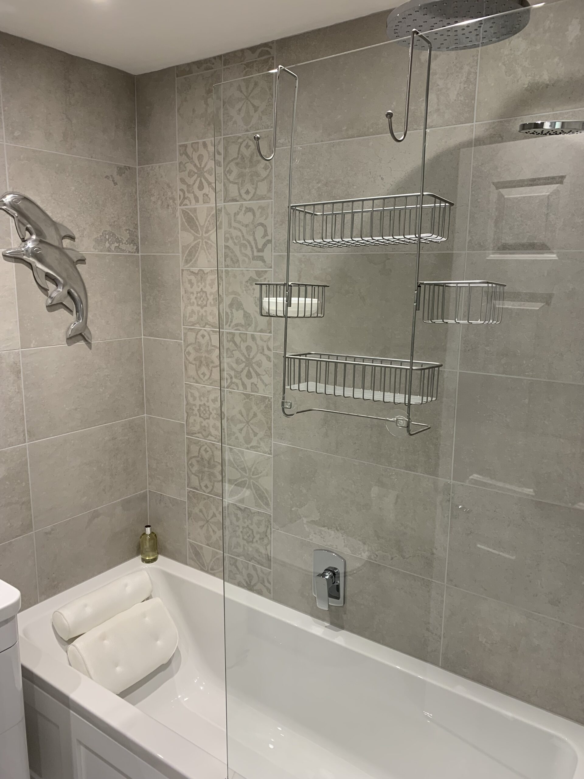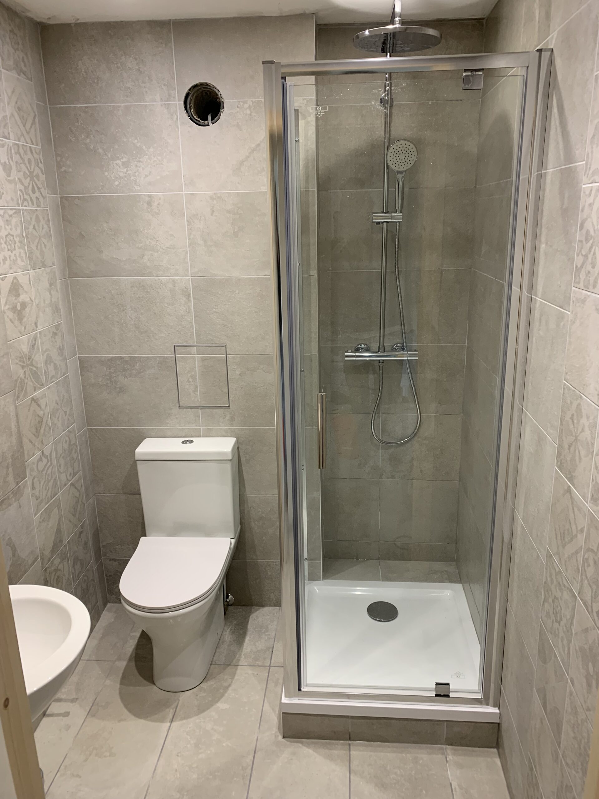 Full floor to ceiling tiles installed with integrated tiled hatch for access to mains water supply.
