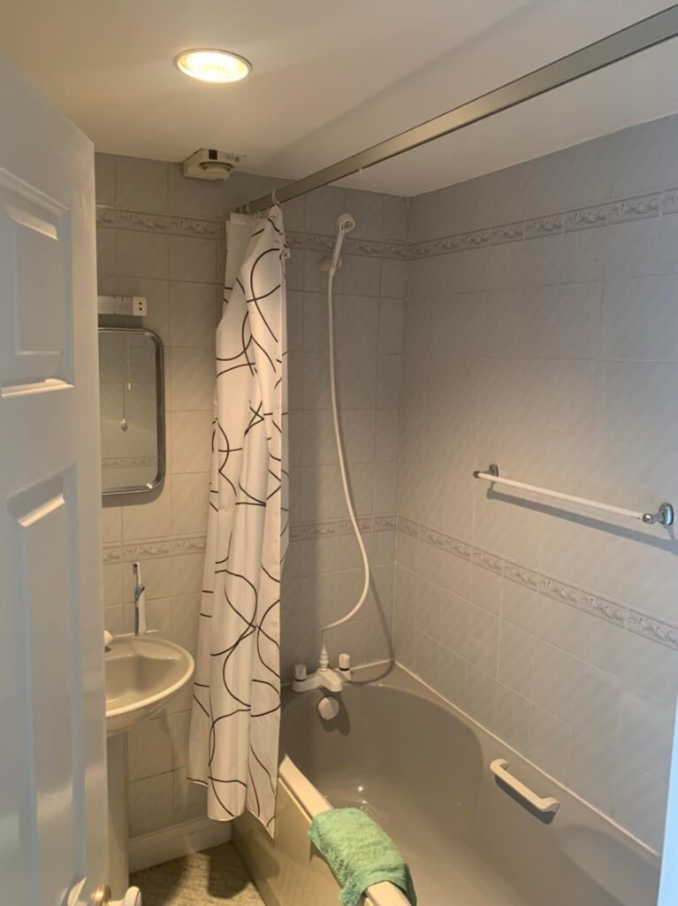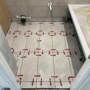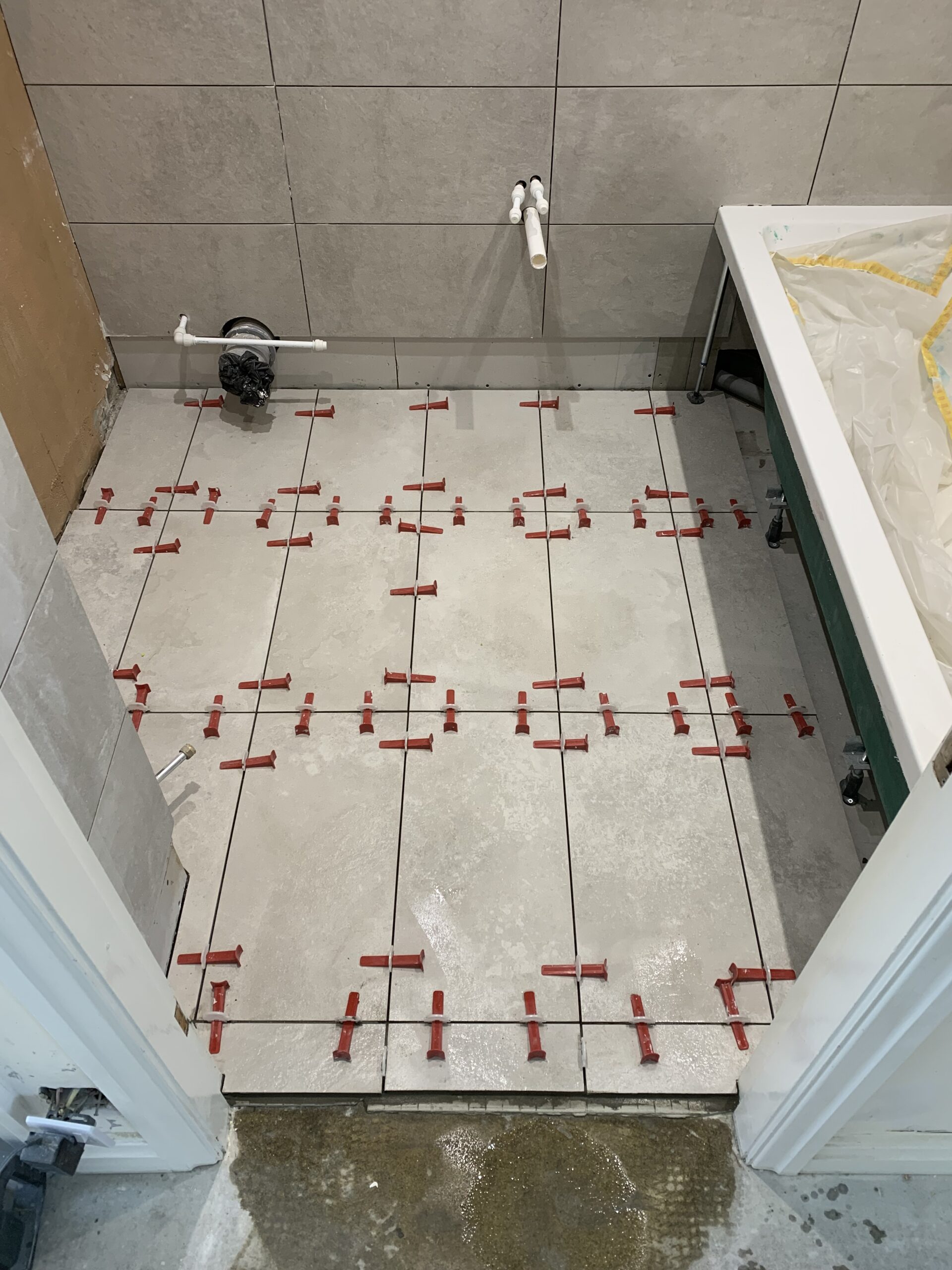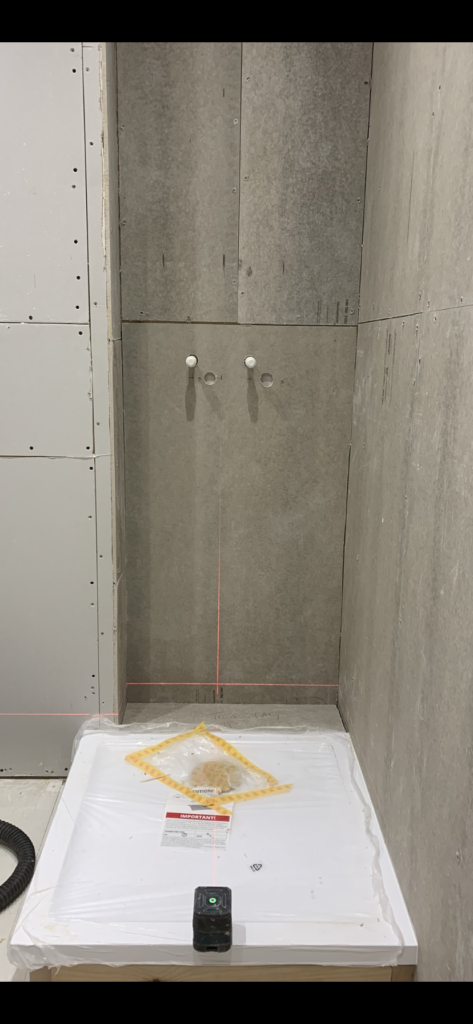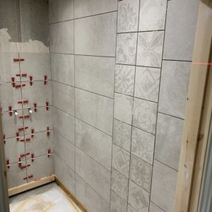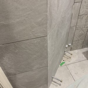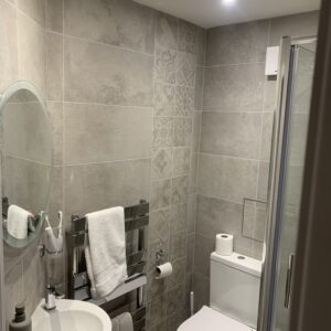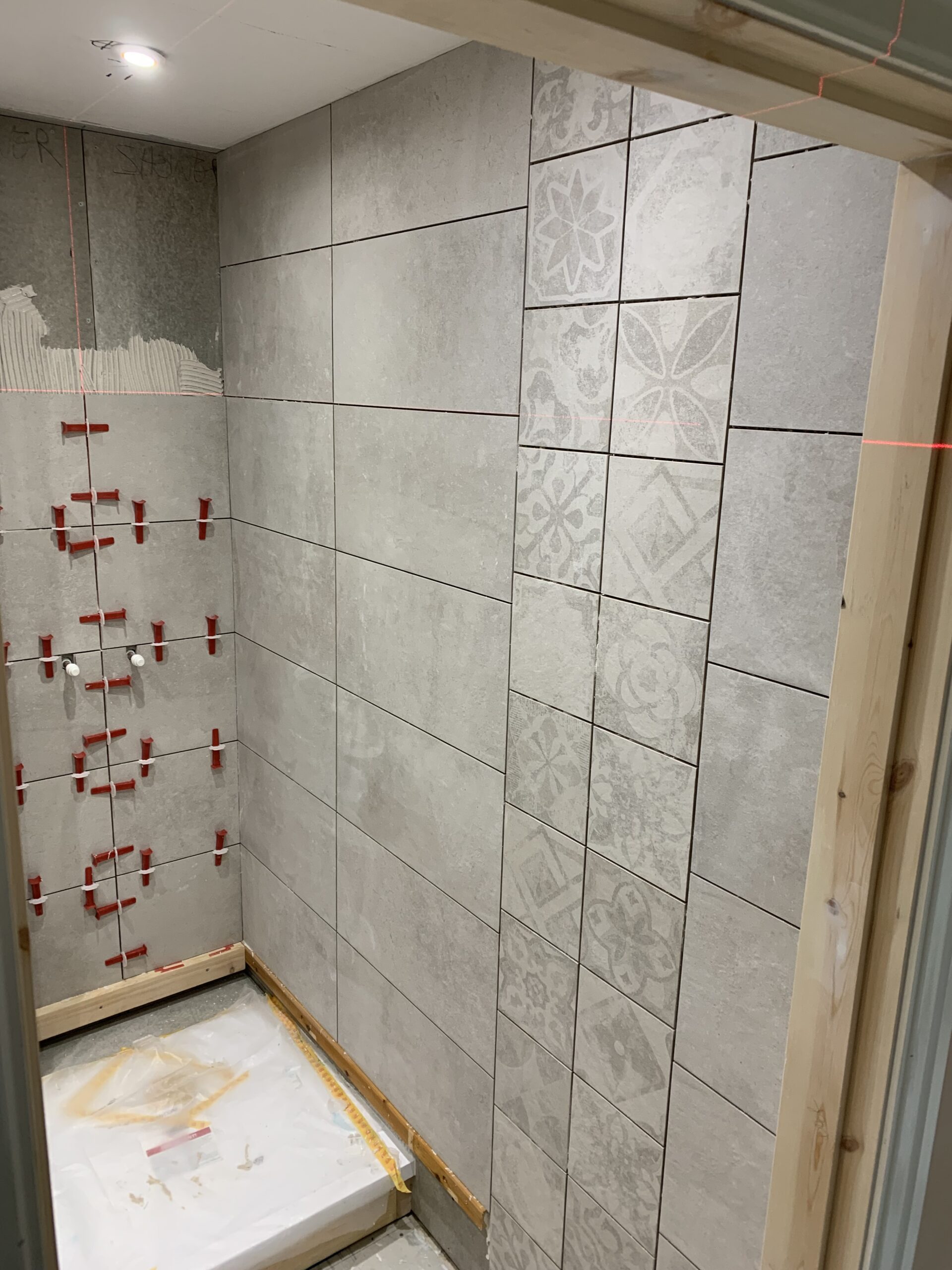 Full floor to ceiling tiles installed with integrated tiled hatch for access to mains water supply.