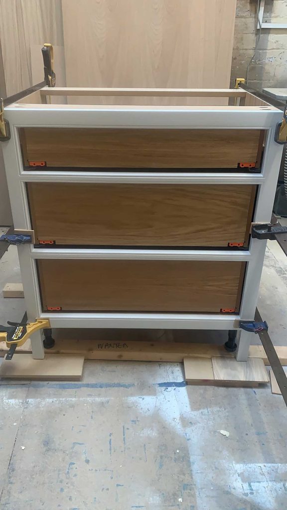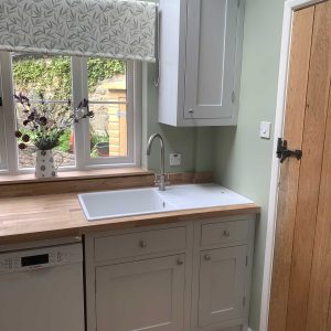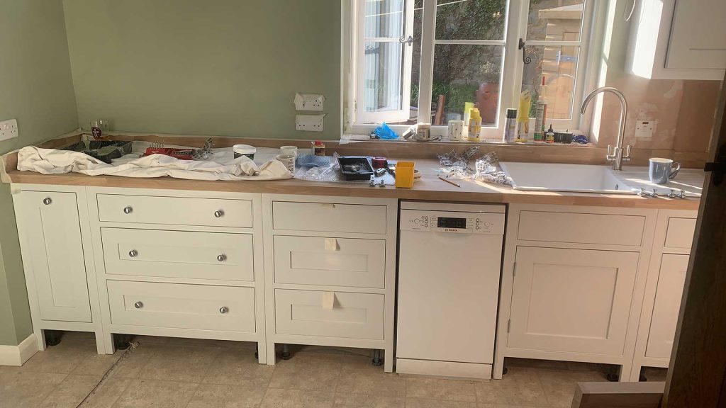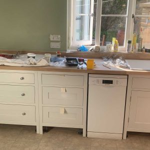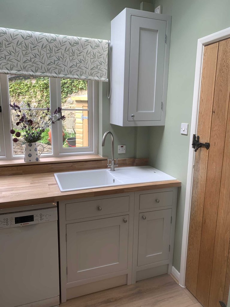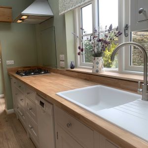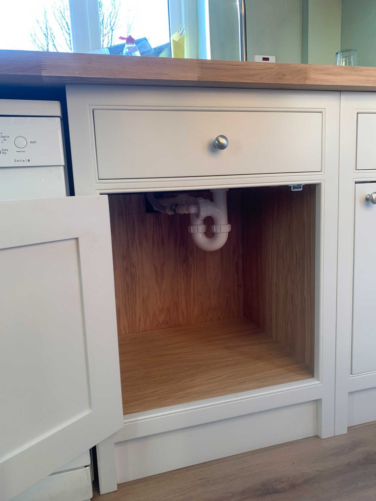 Wall unit made to hide pipe work with shelving inside. Solid oak worktop added over washing machine with end panel.