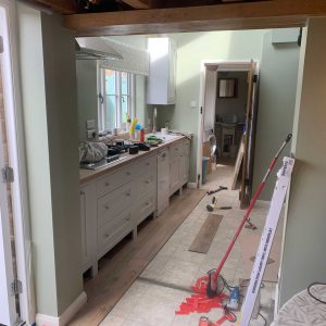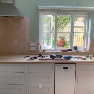 All old kitchen removed with mosaic tiles. Existing extractor left and walls plastered and painted.