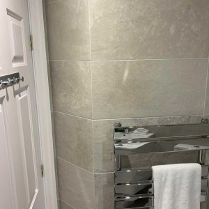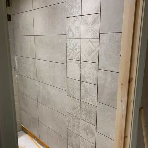- Floor to ceiling tiles with patterned vertical wall detail added to both rooms