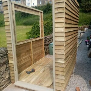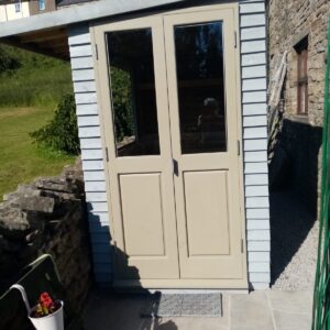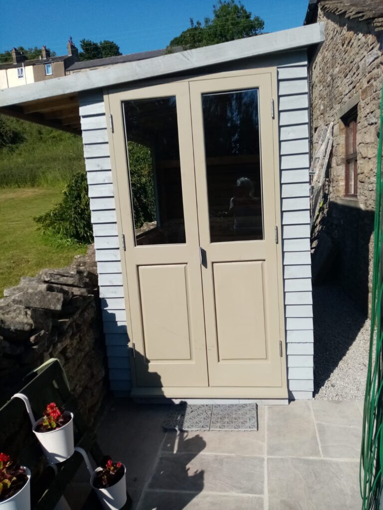 Small garden room with handmade double doors, large window and seating/storage area inside.