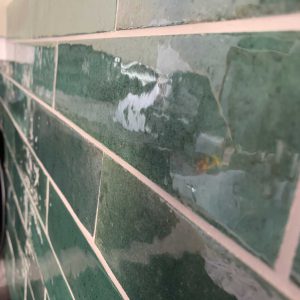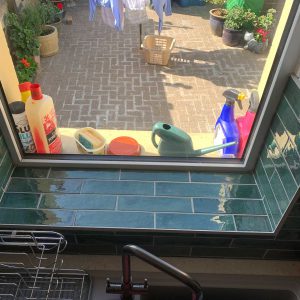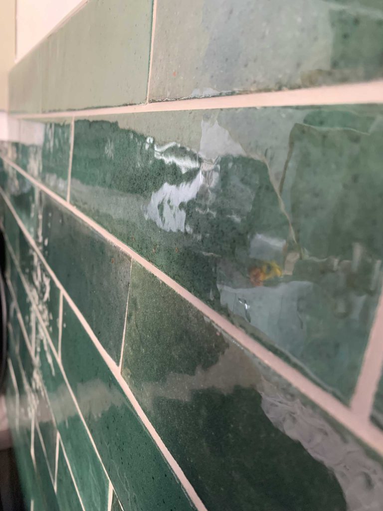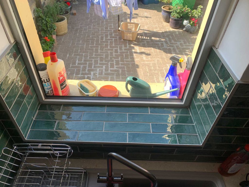Subway/metro tiles installed above speckled stone worktop and window sill.