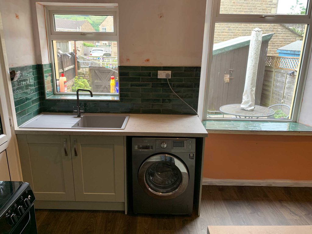 Plumbing was moved from behind the exciting washing machine to allow for it to be pushed in correctly. Fist fix plumbing for sink.