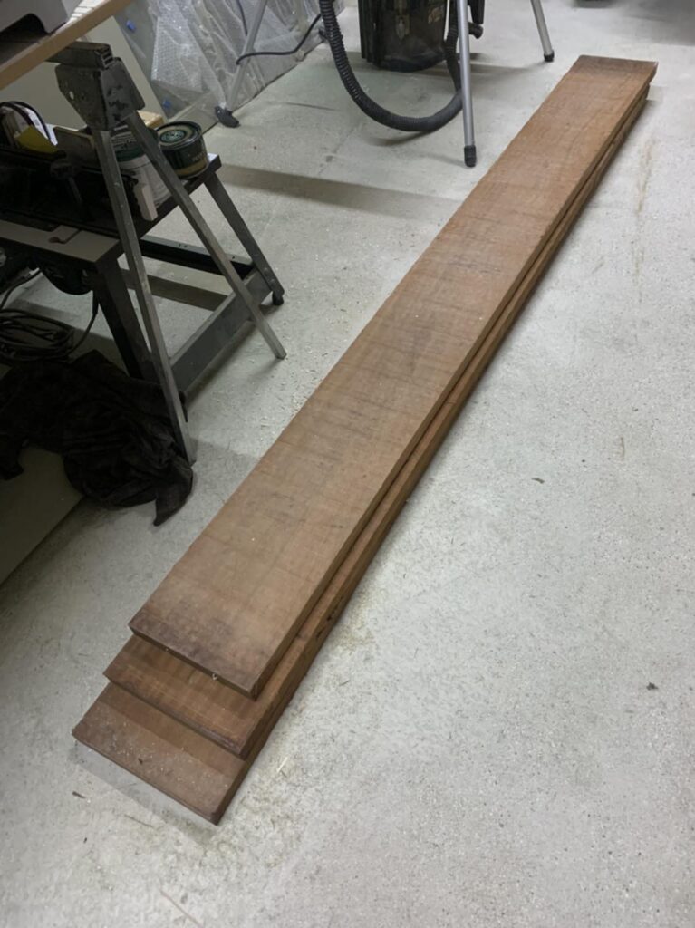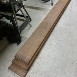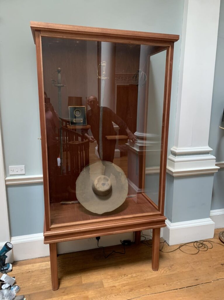 Installed the swords hanging from clear wire and and two small shelves to hold two plaques. A Sapele dowel was installed to hang the large hat.